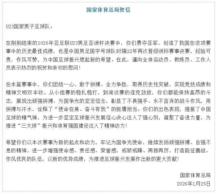 北京时间1月25日凌晨,中国U23男足在沙特吉达进行的2026年U23男足亚洲杯决赛中,以0:4负于卫冕冠军日本队获得亚军。这是中国足球各级国家队时隔22年再次闯入洲际顶级赛事决赛(上次是2004年亚洲杯),也是U23亚洲杯参赛史上的最佳战绩。